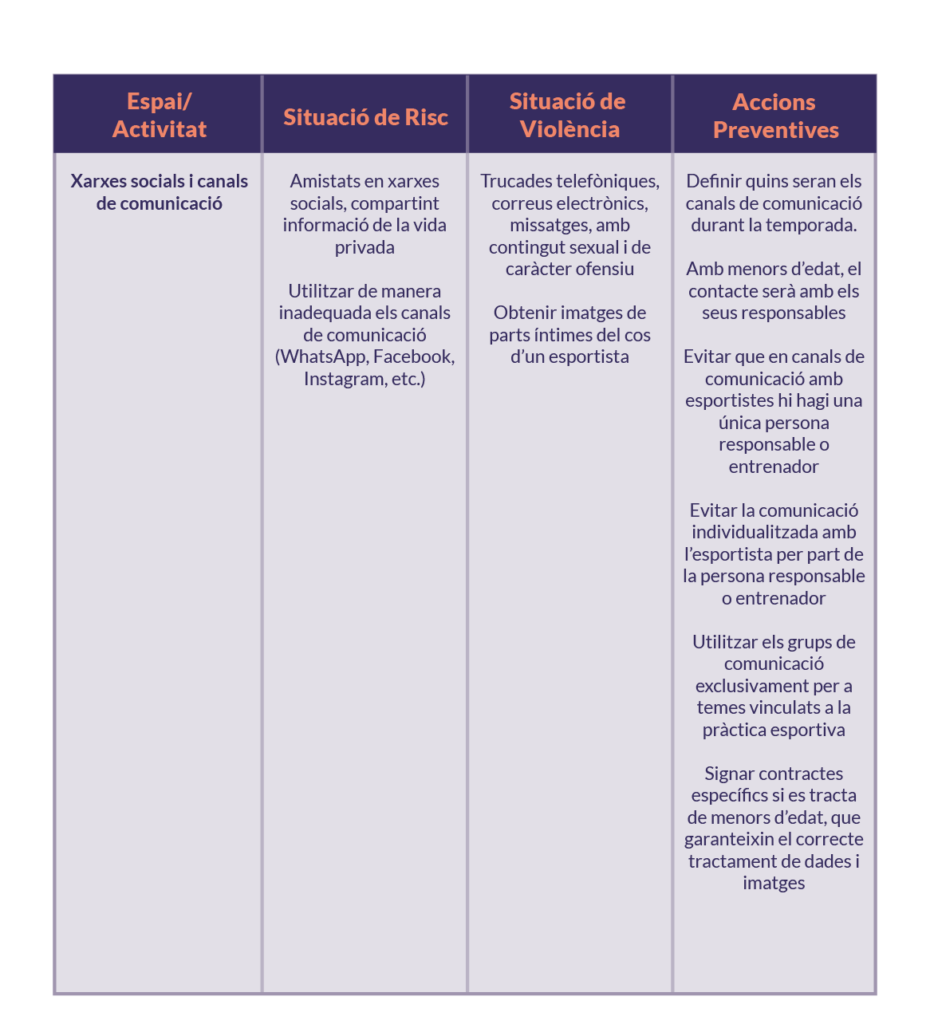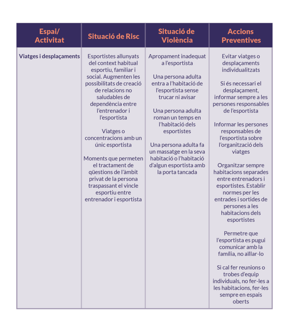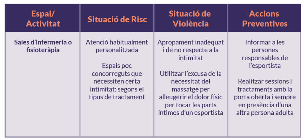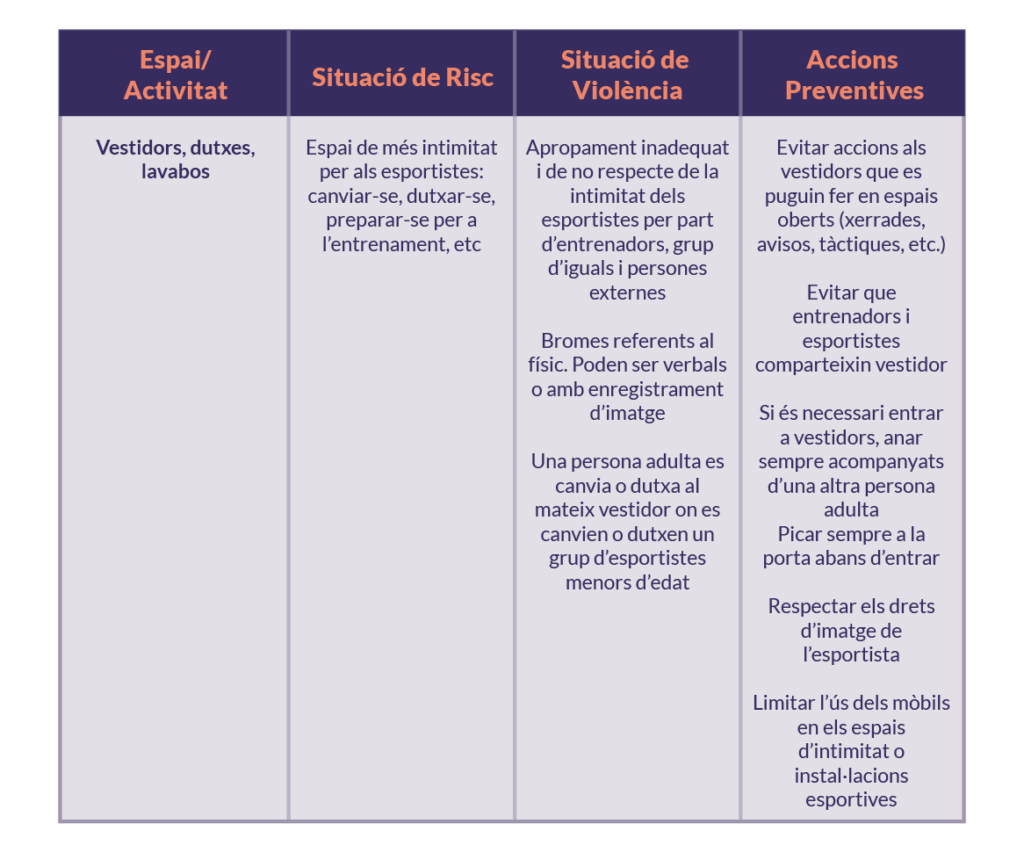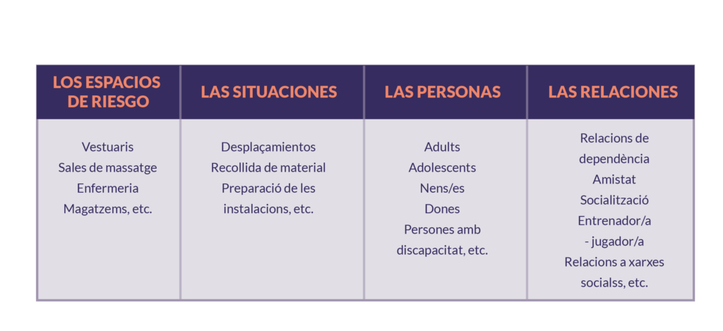 - Els espais susceptibles de protecció per a situacions d’abús o violències són els següents: