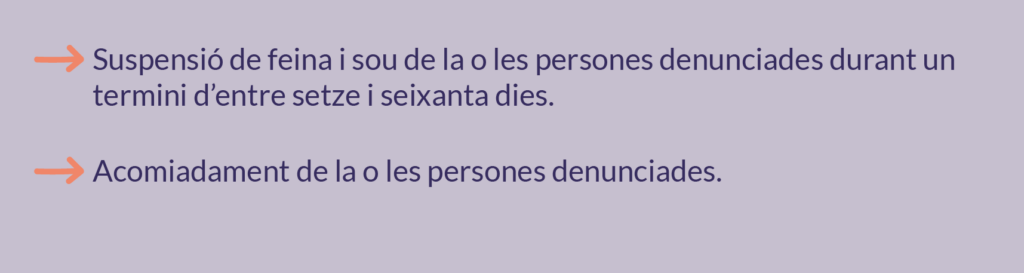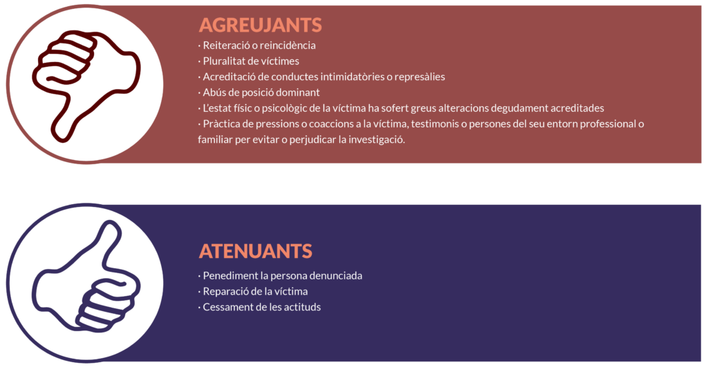 - Si es conclou que hi ha indicis clars dels fets i la o les persones treballen a l’entitat, s’imposaran les mesures disciplinàries pertinents i es traslladarà el cas a la Direcció perquè imposi les sancions previstes al protocol.