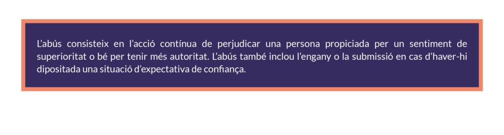 L’abús es manifesta de manera continuada en el temps i es caracteritza per una relació desequilibrada entre els maltractadors i les víctimes. Aquesta relació implica imposició i inducció, que tant pot ser en l’aspecte físic, com en l’emocional, en el sexual o en el moral, o bé implica omissió, com pot ser el cas de l’abandonament físic o emocional de les persones dependents. L’abús, de vegades, pot ser molt difícil de detectar.