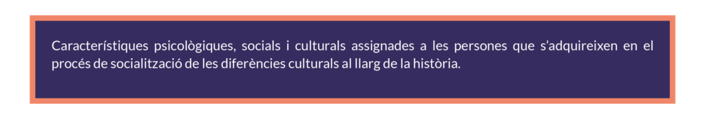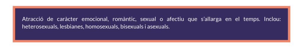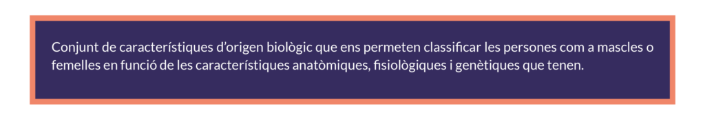 Sexe (“Com sóc?”): mascle, femella, intersexual. Identitat de gènere (“Qui sóc?”): home, dona, persona no binària, agènere. Orientació sexual (“Qui m’atrau?”): heterosexual, homosexual, bisexual, asexual, etc.