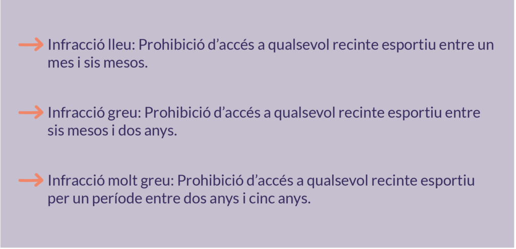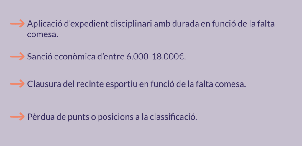 El protocol considera els casos d’assetjament i de discriminació com una falta molt greu que pot comportar l’expulsió de la o les persones autores, en el cas de treballadors, socis o esportistes; i la inhabilitació permanent, en el cas de les persones integrants del Consell Directiu. En aquest mateix sentit, es contempla un ampli ventall de mesures ex-ante (mesures cautelars) i ex-post (mesures complementàries a les sancions) de la tramitació del procediment per assegurar el màxim suport, confort i reparació possible a la persona afectada.