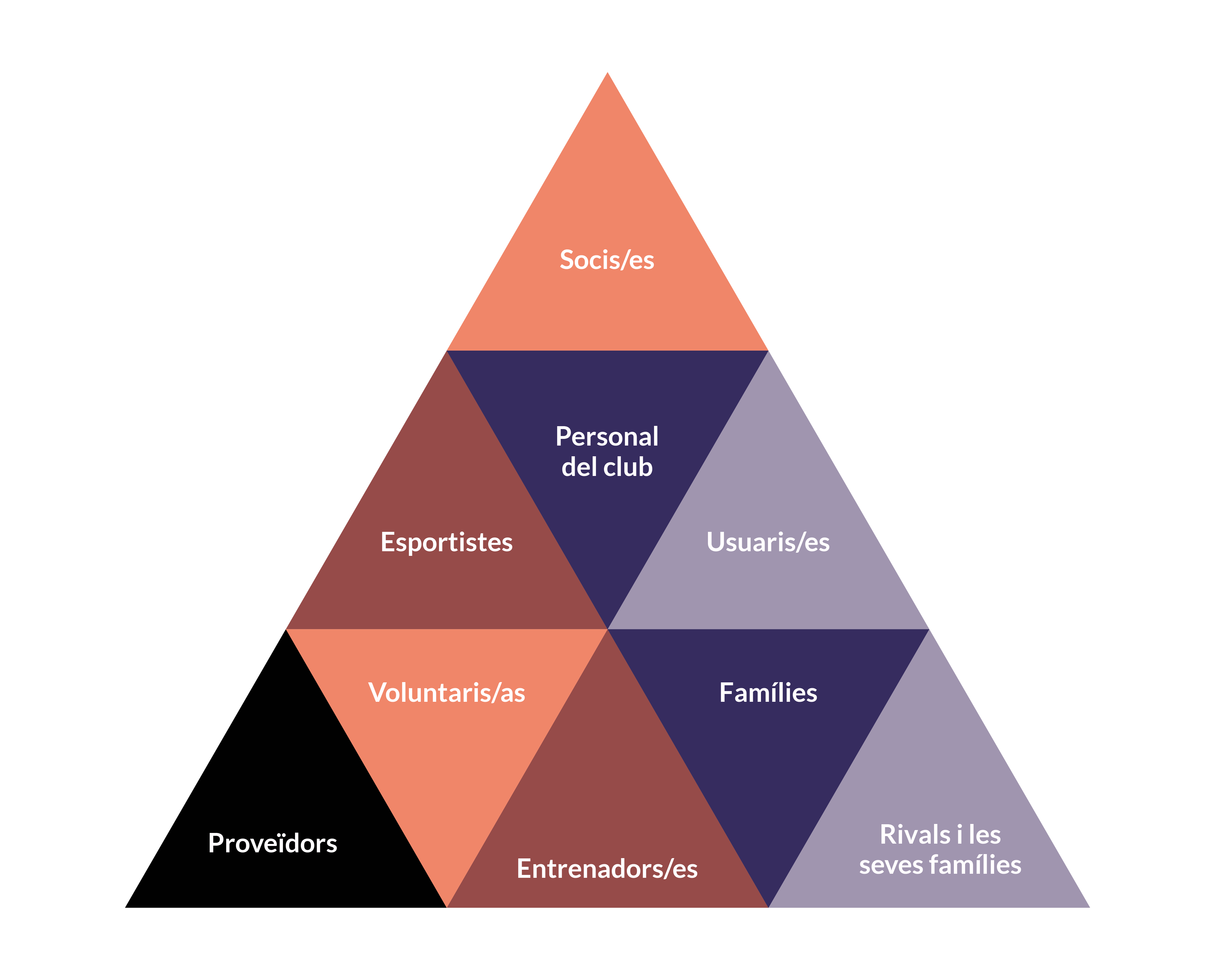 Això inclou també les famílies dels esportistes i els usuaris, ja que es té en compte el paper significatiu que juguen en la prevenció i actuació davant aquest tipus de casos. A la piràmide pots veure els diferents grups implicats.